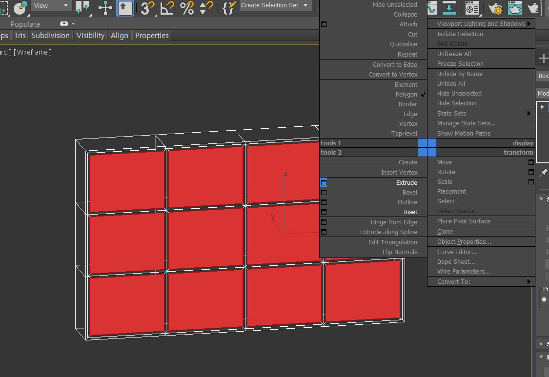 Selection→Polygon [단축키 4]를 누르고 Ctrl+칸 하나씩 클릭 후 마우스 우클릭→Extrude 글자 옆 네모박스 클릭