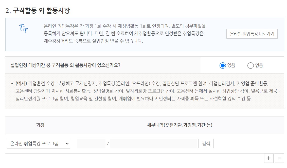 실업인정 정보를 입력하고 다음으로 넘어가면 재취업 활동에 대한 입력 항목이 있다.
