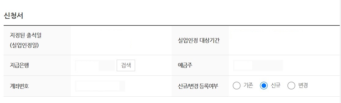 센터에 방문하여 실업급여 신청을 마치면 <신청인정보, 실업인정내용, 신청서 양식>이 채워져 있으며 지급 은행, 예금주, 계좌번호, 신규/변경 등록여부를 잘 확인하고 작성하면 된다.