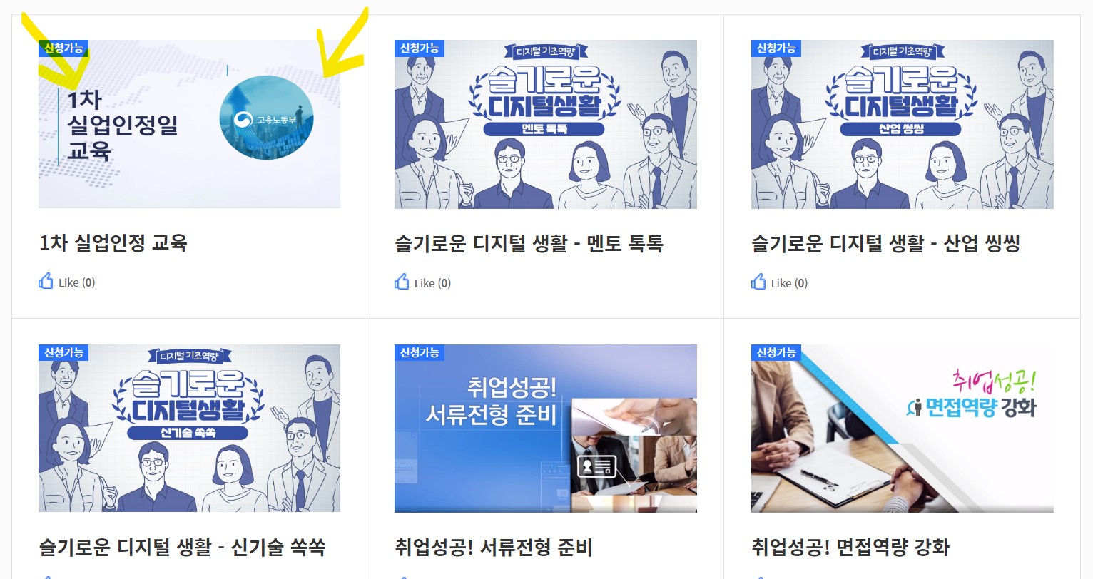 고용노동센터에 가서 실업급여 신청을 마치면 <1차 실업인정>날짜를 정해준다. 정해진 날짜 안에 [1차 실업인정 온라인 취업 특강]을 수강하고 해당 날짜에 맞춰 인터넷으로 실업인정 신청을 반드시 해야 한다.
